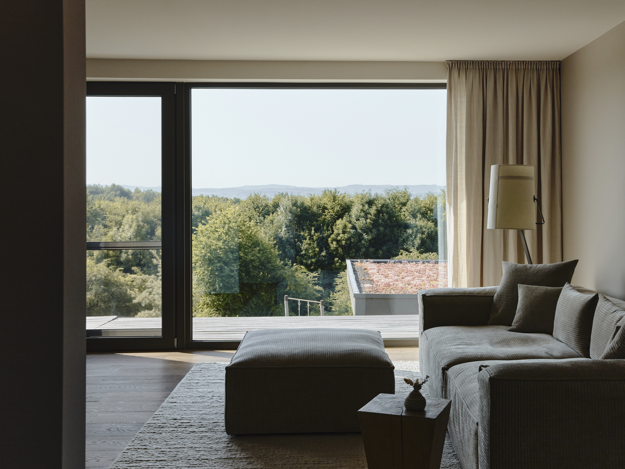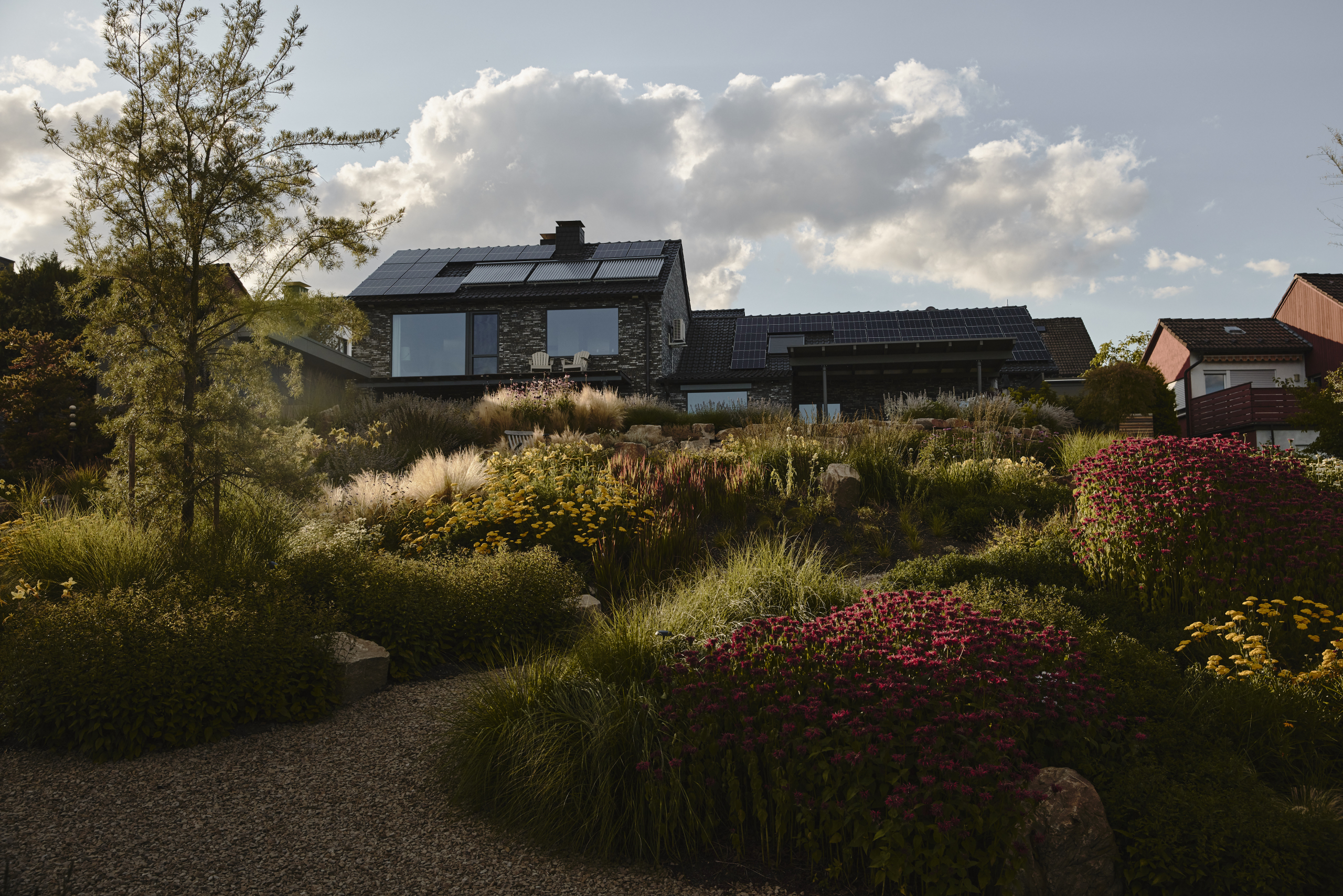 Ergänzt wurde das Projekt durch eine klimaresiliente Gartengestaltung, die ökologische Aspekte mit hoher Aufenthaltsqualität verbindet. Dafür wurden Nebengebäude im Garten zurückgebaut. Besonderes Wohlempfinden und Wunsch der Bauherr*Innen war ein Pool mit zusätzlicher Abdeckung zur nachhaltigen Nutzung. Durch seine Positionierung im Garten unterstreicht er einen ungestörten Blick in die Weite.