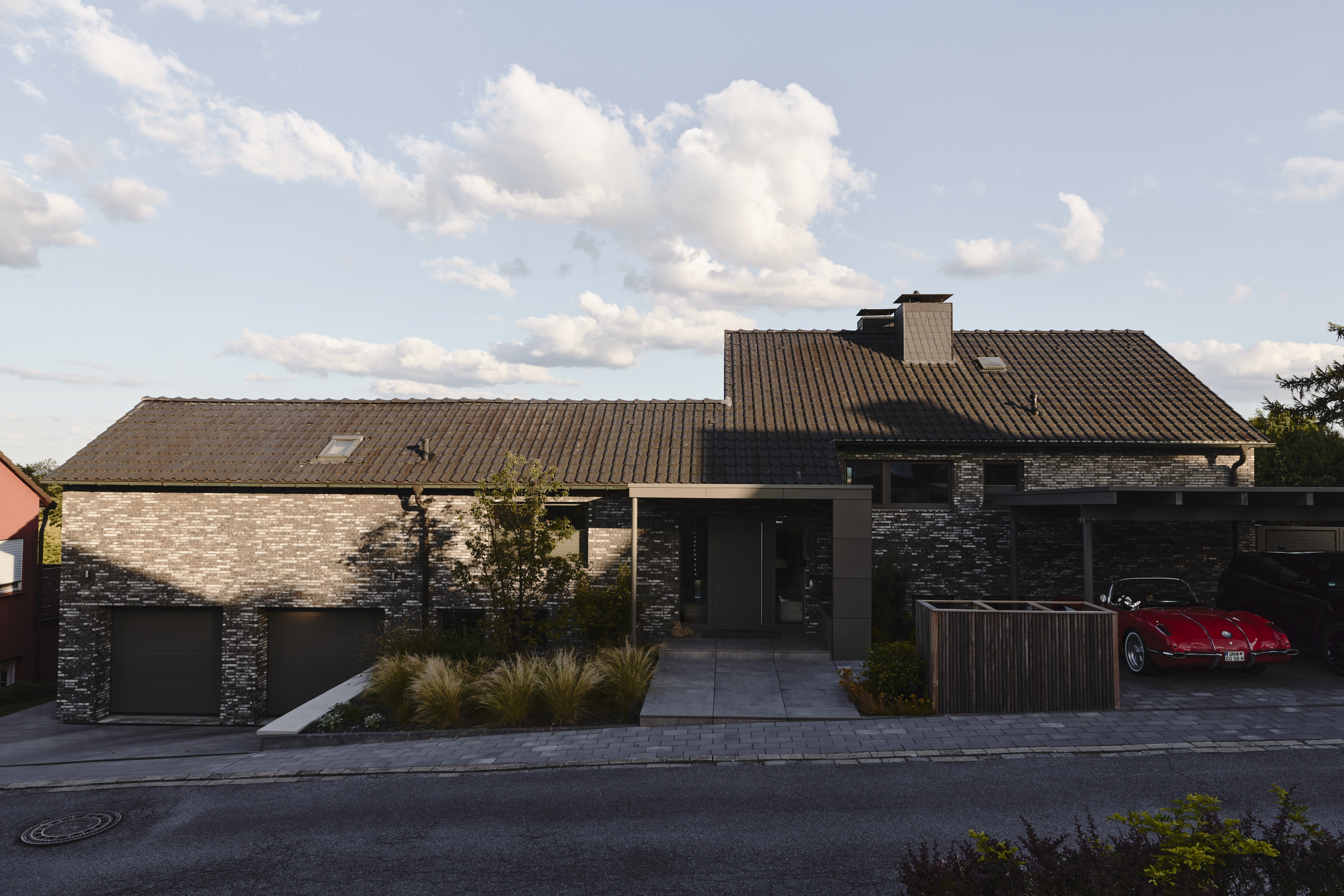 Die zweigeschossige Immobilie erhielt eine komplett neue Fassadengestaltung: Eine zusätzliche Dämmung sowie Klinker-Riemchen verleihen dem Gebäude ein zeitgemäßes, wertiges Erscheinungsbild, ohne dabei die ursprüngliche Kubatur zu verändern. Auch die bestehenden Fensteröffnungen wurden beibehalten und lediglich auf der Gartenseite vereinzelt vergrößert, um den Weitblick in die Landschaft noch stärker in den Wohnraum zu integrieren.