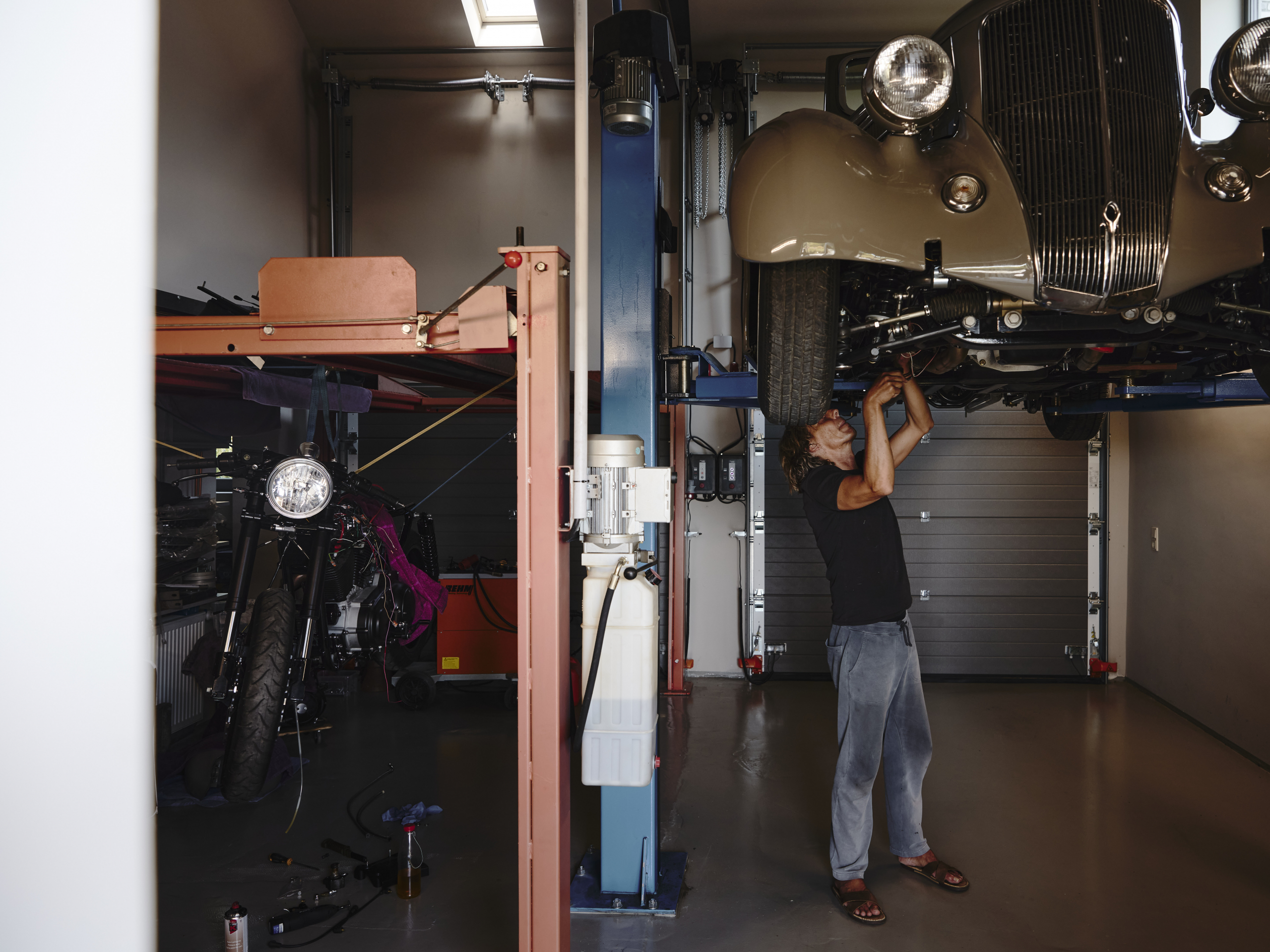 Der Grundriss blieb weitgehend unangetastet und wurde nur dezent an heutige Wohnbedürfnisse angepasst. Technisch anspruchsvoll war die Umgestaltung der Garage: Durch den Rückbau der Decke und den Einbau einer komplexen Stahlkonstruktion, in enger Zusammenarbeit mit dem Statiker, konnte Platz für zwei Hebebühnen geschaffen werden, um der Leidenschaft der Bauherr*Innen für amerikanische Oldtimer Raum zu geben.